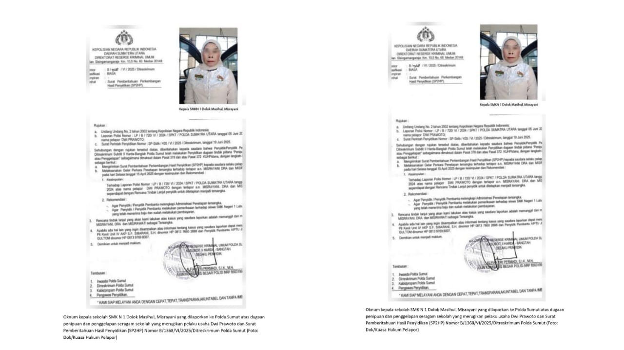 Medan, seputaranindonesia.com — Proses hukum kasus dugaan tindak pidana penipuan dan penggelapan yang menyeret nama Kepala SMKN 1 Dolok Masihul, Misrayani SPd MSi, masih terus bergulir di Polda Sumatera Utara (Sumut). Hingga kini, meski telah ditetapkan sebagai tersangka, Misrayani belum juga ditahan oleh pihak kepolisian.