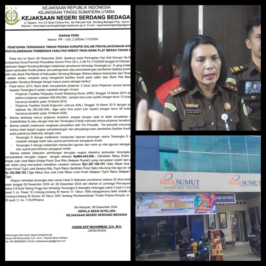 Perkara ini berawal dari dugaan kerugian negara sebesar Rp964.542.008 yang berasal dari selisih baki debet kewajiban nasabah sebesar Rp1,26 miliar, dikurangi nilai agunan yang dihitung oleh penyidik Pidsus Kejari Sergai serta kantor akuntan Ribka Aretha & Rekan senilai Rp302 juta.