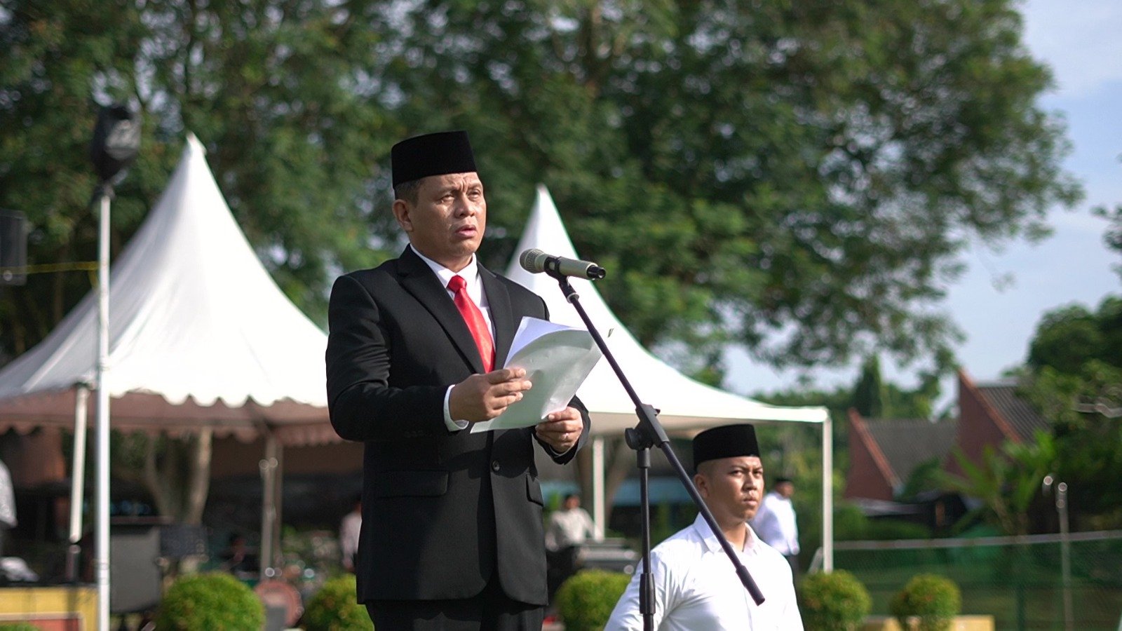 Dalam suasana yang penuh kebanggaan, pasukan pengibar bendera (Paskibraka) melaksanakan tugas mereka dengan sempurna, memasang dan mengibarkan bendera Merah Putih diiringi lagu kebangsaan “Indonesia Raya”. Seluruh peserta upacara memberikan penghormatan yang tulus selama prosesi ini berlangsung.
