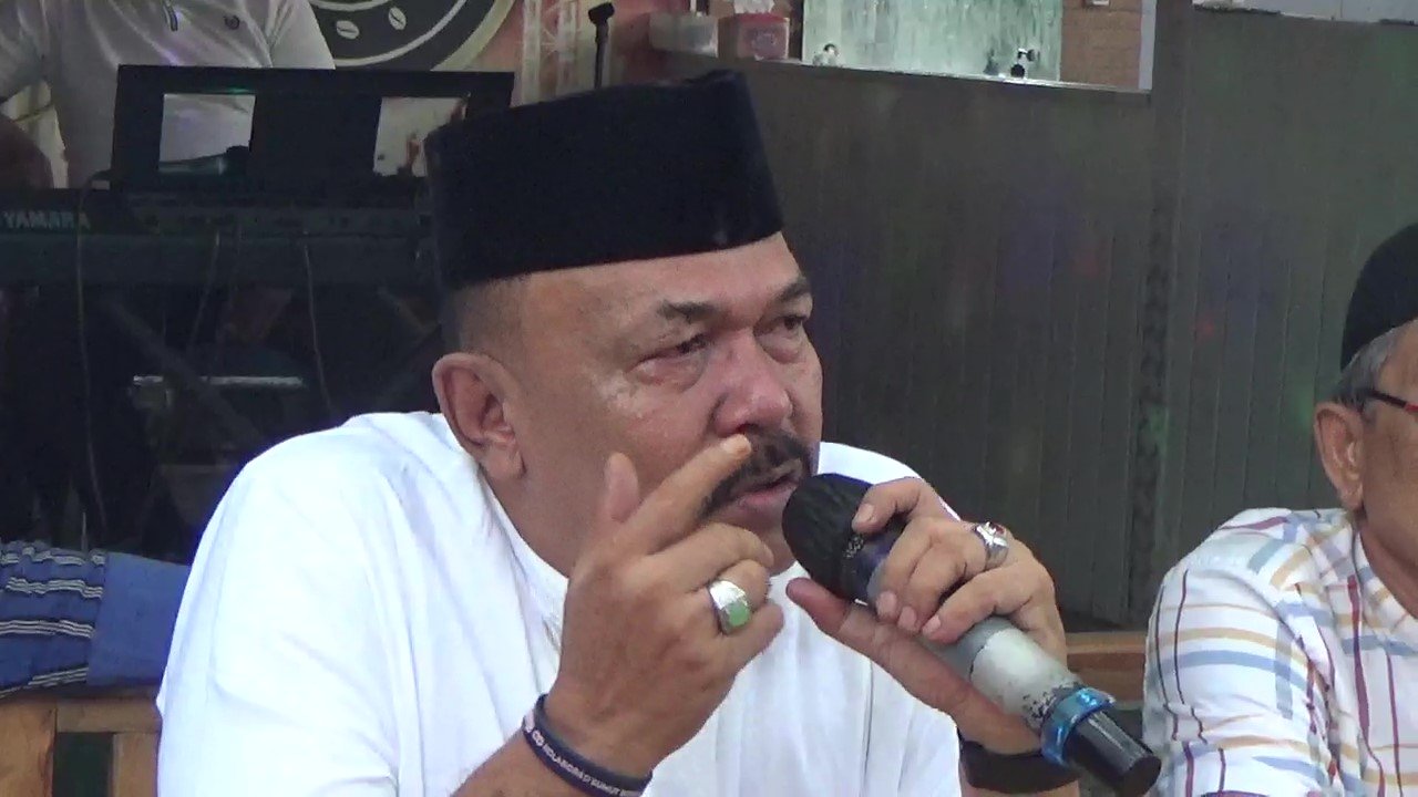 Pembina Pasti Bobby Sumut, Ir H Erwan Rozadi Nasution dengan rasa haru saat pidato sambutan yang didampingi petinggi pasti Bobby Sumut yang digelar di De'nasti Coffee Deli Serdang pada Jumat Sore, 22 November 2024.