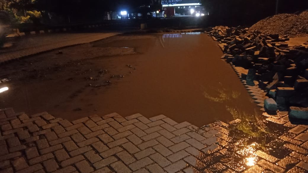 Berdasarkan pantauan di lapangan, Kamis (25/09/2025), sebagian area jalan terlihat telah digali dan tergenang air, sehingga membentuk lubang cukup besar. Lubang tersebut berada tepat di samping tumpukan material berupa paving block, kerikil, dan pasir yang berserakan hingga ke bahu jalan.